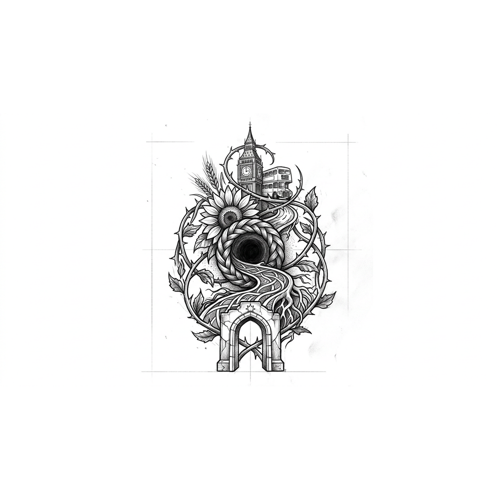 Сгенерировать тату ескиз. У меня така идия тату что бы росказала не много моей жизни. Моя история: жил в Латвии(памятник свободы), Украине(родина мать), Польше( ринек глувний)а сейчас живу в Англии(лондон). Можешь сделать ескиз как может выглядеть. Что был очень трудный путь. Без прапоров, без написание, без людей.