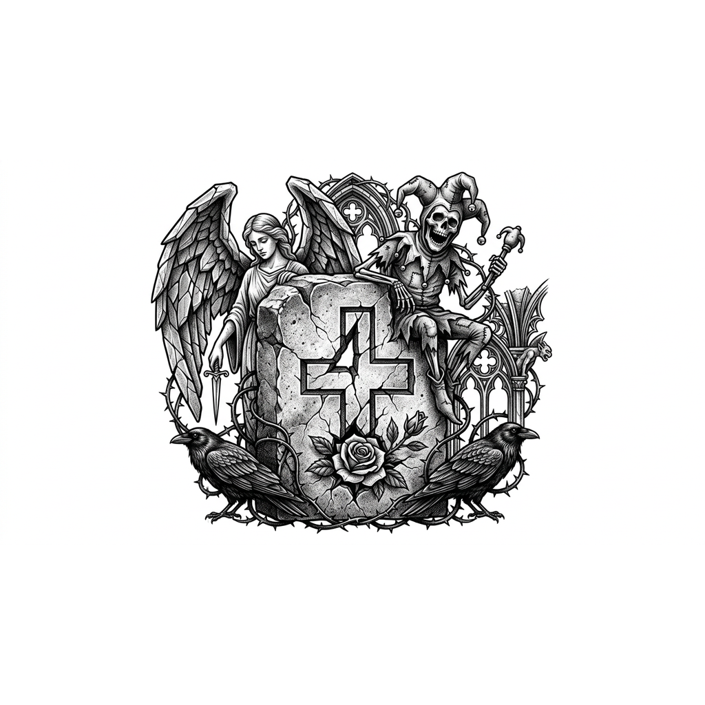 В центре огромная гранитная плита, треснувшая крест-накрест. Трещины образуют цифру 4. Она выглядит естественно, будто сам камень раскололся в эту форму. На вершине плиты сидит шут-скелет: череп с бубенцами на колпаке в одной руке игральная кость или карта ухмылка, как будто он смеётся над жизнью и смертью Слева за плитой стоит ангел-убийца: крылья из каменных осколков, лицо спокойное, в руке тонкий кинжал или коса У основания плиты роза, пробивающаяся через камень