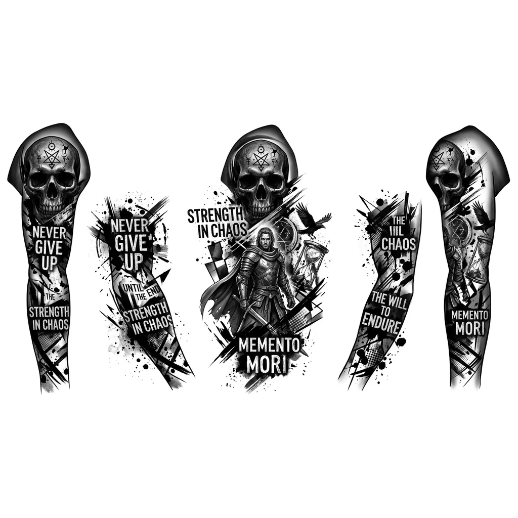 Рукав на всю руку с черепом и надписями Можно добавить мистики Череп расположи на плече Ниже изображение человека или воина Надпись вроде ни когда не сдавайся или или то конца