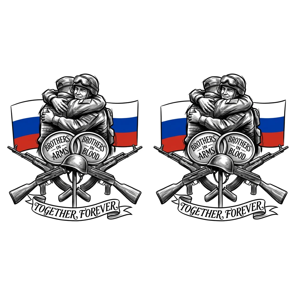 Сделай эскиз, в верхней части стоят спиной два солдата по обнимая друг друга ниже 2 переплетенных жетона, на одном написано братья по оружию, на втором братья по крови, В самом низу лента на которой написано вместе навсегда, выше ленты изображены 2 автомат Калашникова скрещенных посередине них стоит палка на которой висит каска, на заднем фоне изобрази флаг России