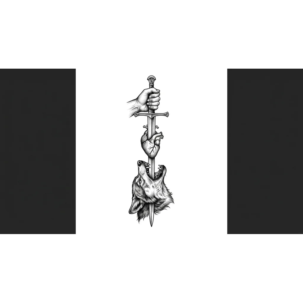 Рука сверху В нее воткнут меч На мече ниже сердце А под этим всем волк с открытой пастью,куда входит конец меча