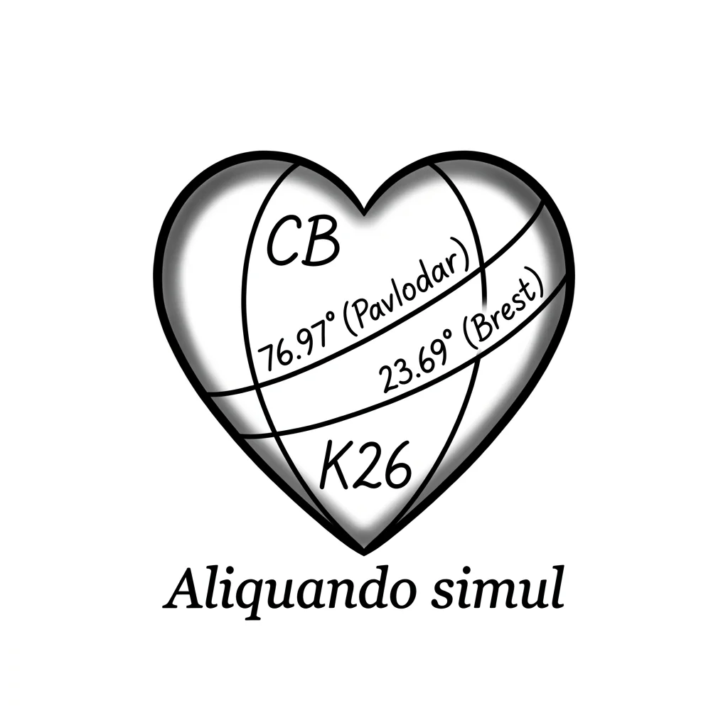 Размер: 2.5×2 см. · Идея: Сердце, образованное пересечением долгот. · Эскиз: · Контур сердца, внутри которого две изогнутые линии, имитирующие меридианы. · На одной линии подпись 76.97° (Павлодар), на другой 23.69° (Брест). · В верхней части сердца — ник CB, в нижней — K26. · Под сердцем: "Однажды мы будем вместе" на латыни "Aliquando simul".