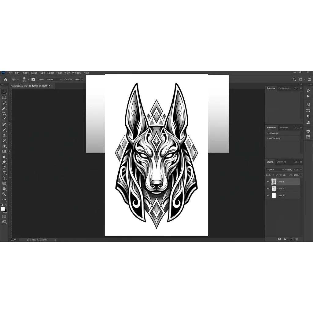 Создать эскиз тату размером 35см на 22 см внутри голова Анубиса а вокруг стиль Полинезия с тенями более похожий на ромб