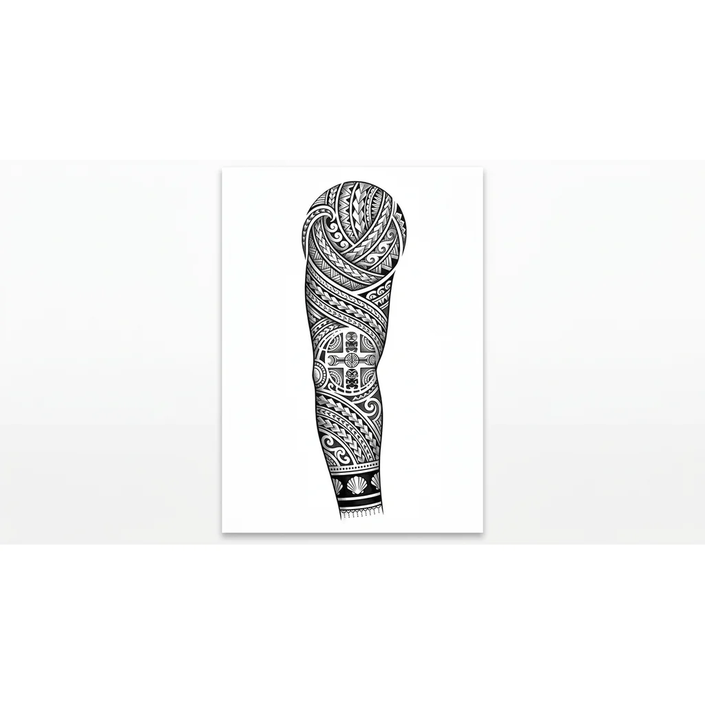 рукав тату в стиле полинезия,на локте крест marquesan,конец предплечья заканчивается браслетом