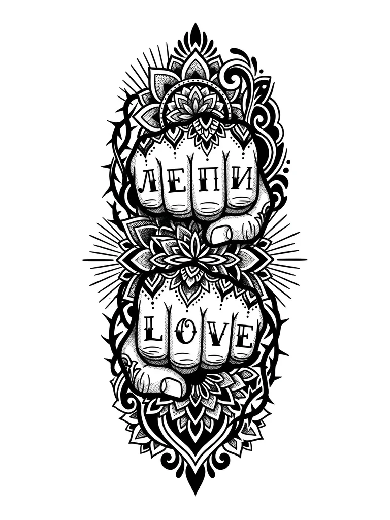 Два кулака. Буквы на пальцах. Слева направо: Л, Е, П, И, L, O, V, E