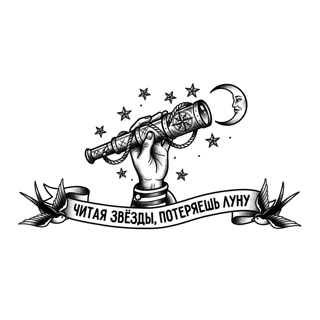 Тату эскиз Традиционный — Эскиз татуировки с надписью "читая звёзды, потеряе...