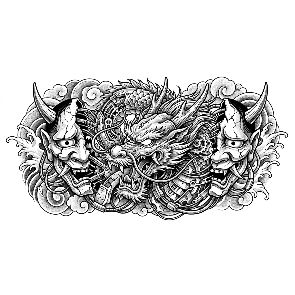 Хочу тату для мужской груди, в японском стиле в перемешку с биомеханикой, оригинальную , по центру голова дракона по бокам разрезаная демоническая маска, с рваными краями