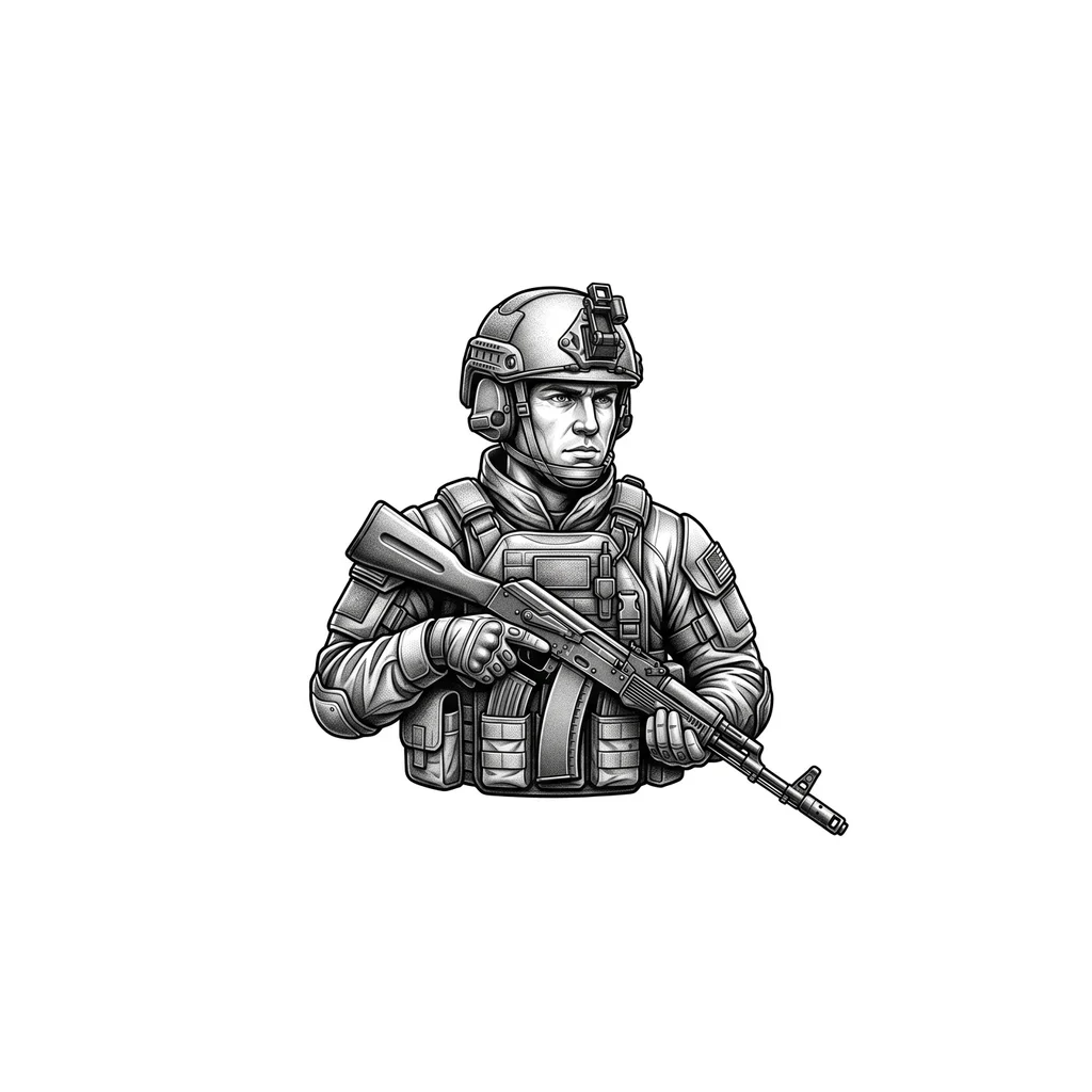 На груди тату свошника, с автоматом ак 74 , в броне и шлеме