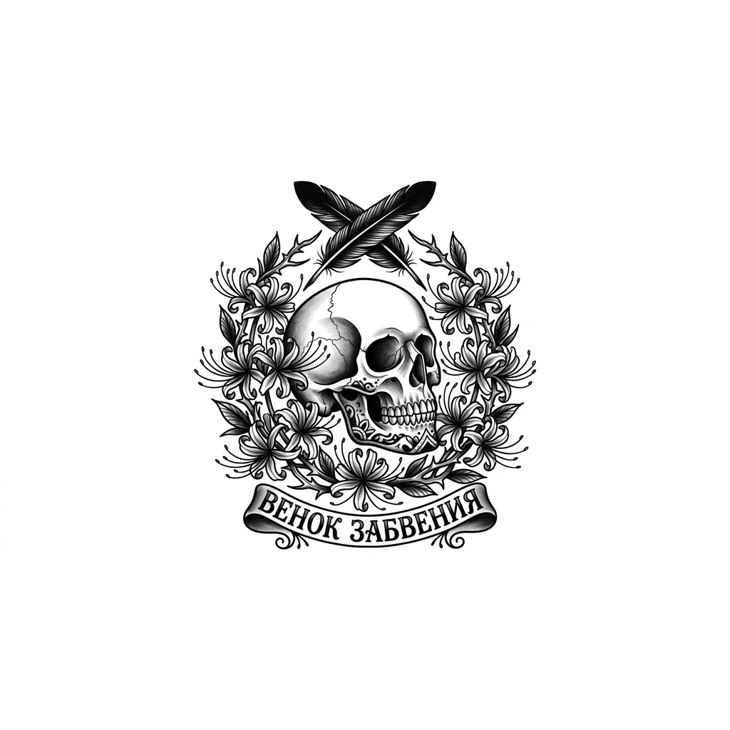 «ВЕНОК ЗАБВЕНИЯ» Более мягкий, женственный, но с мрачным подтекстом. – Центр: Череп (нежить), но в профиль или окруженный костяными ветвями. Череп может быть украшен славянским орнаментом по нижнему краю челюсти. – Окружение: Цветы Ликориса сплетены в полукруг или венок вокруг черепа. – Символизм: Сверху над черепом может парить ворон или просто пара черных перьев. Ликорис здесь символизирует прощание, а череп — вечную память. – Размер: от шейного позвонка до поясничного позвонка
