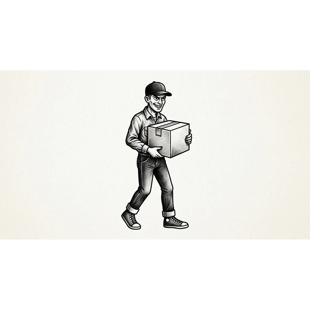 Грузчик в бейсболке с коробкой в руках, со зловещей улыбкой, в городской одежде, в джинсах и кроссовках, телосложение стройное