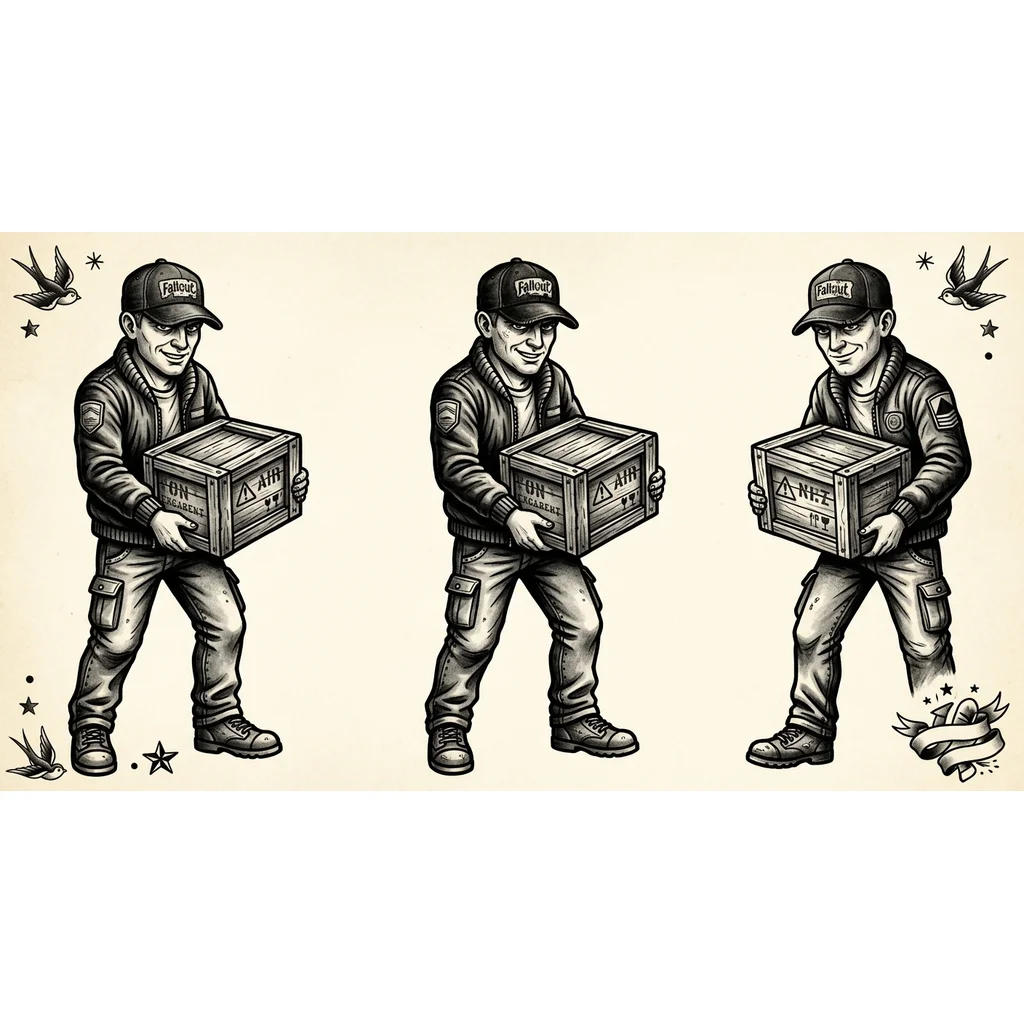 Грузчик в бейсболке с коробкой в руках, со зловещей улыбкой, в городской одежде, в джинсах и кроссовках, телосложение в стиле Фоллаута
