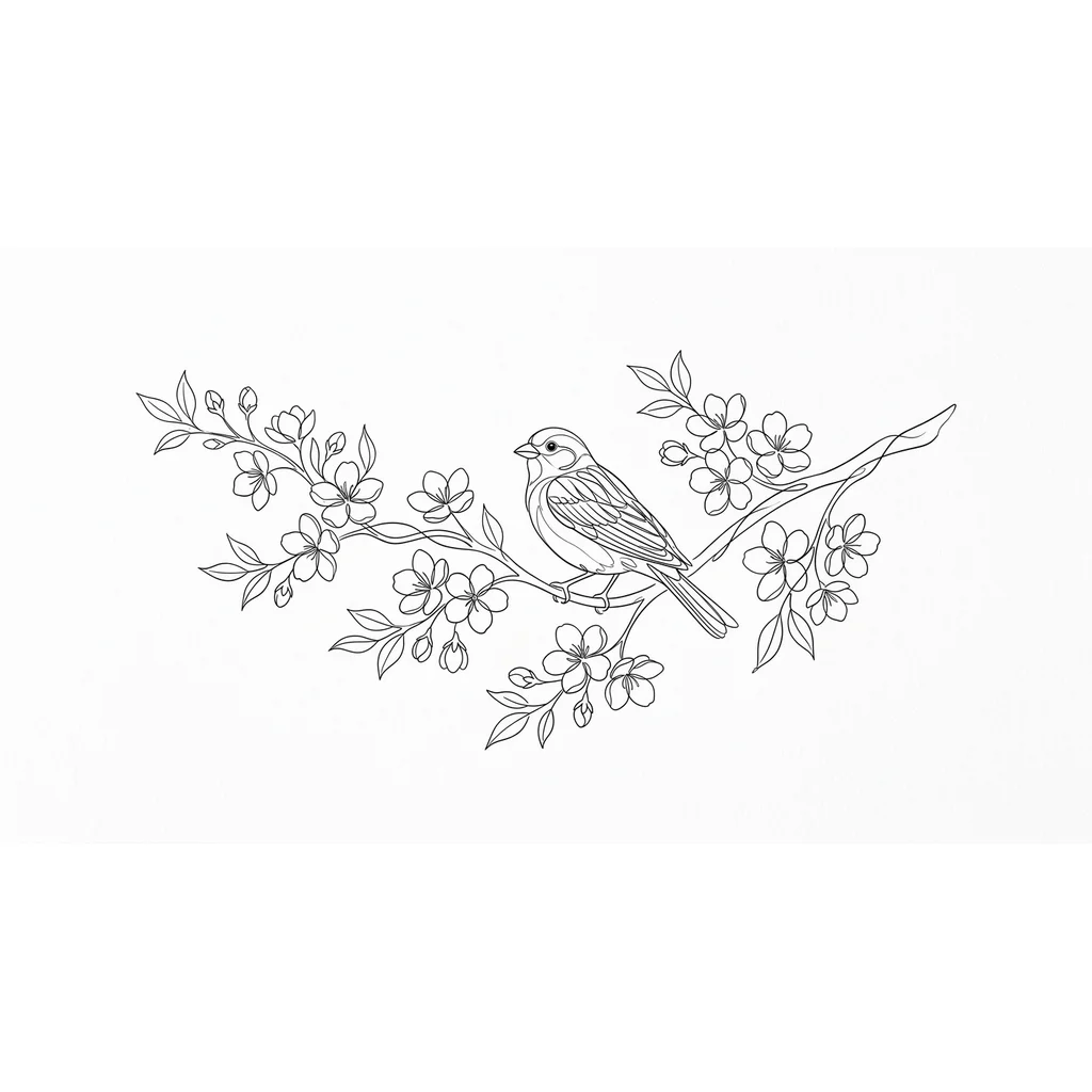 сакура тонкие линии с птицей