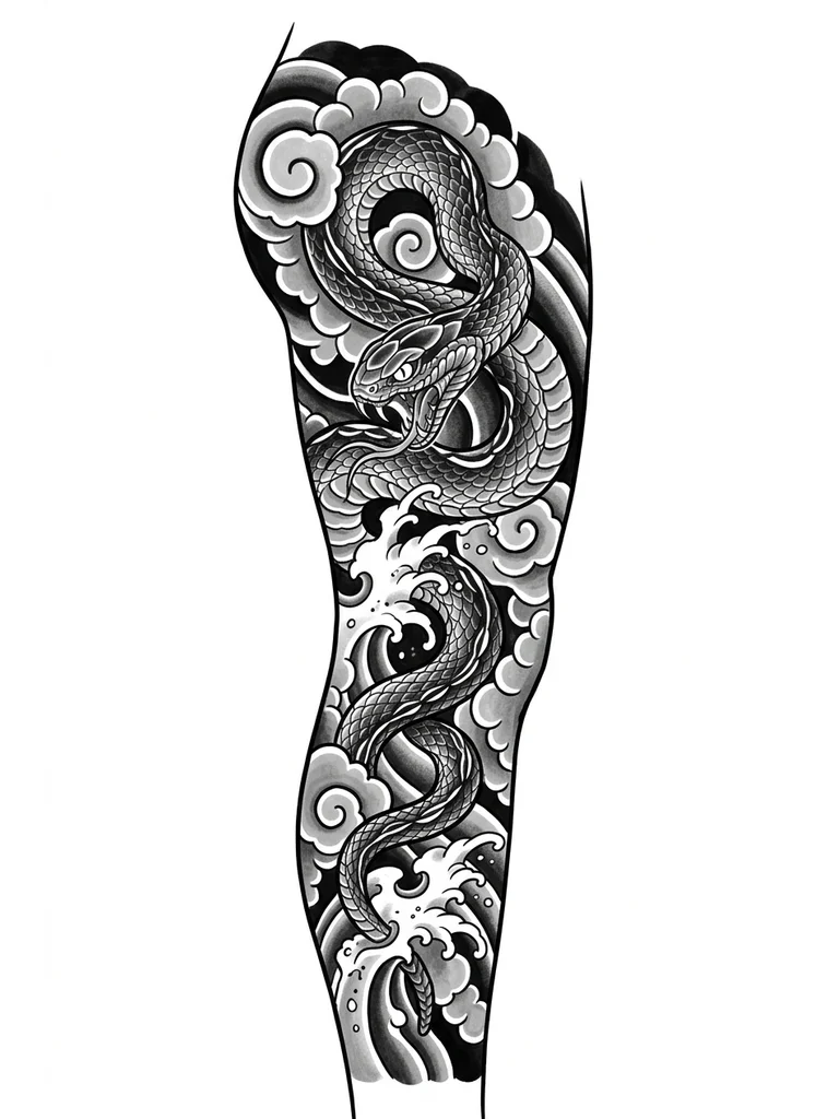 Сделай развертку тату в японском стиле, на ноге с элементами блекворк с облаками змеем и волнами