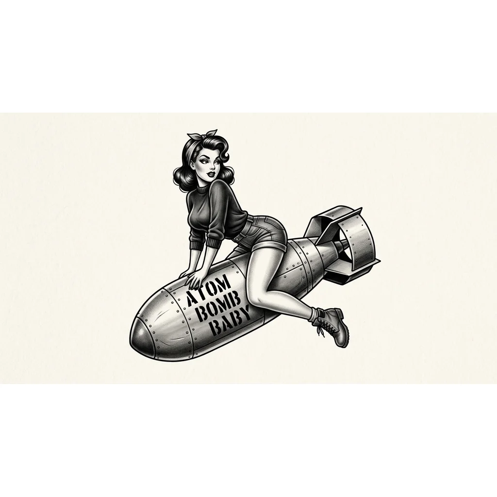 Чёрно-белая тату, сексуальная девушка с большими бёдрами и большой грудью оседлала бомбу, в стиле пин-ап. Надпись на бомбе Atom Bomb Baby