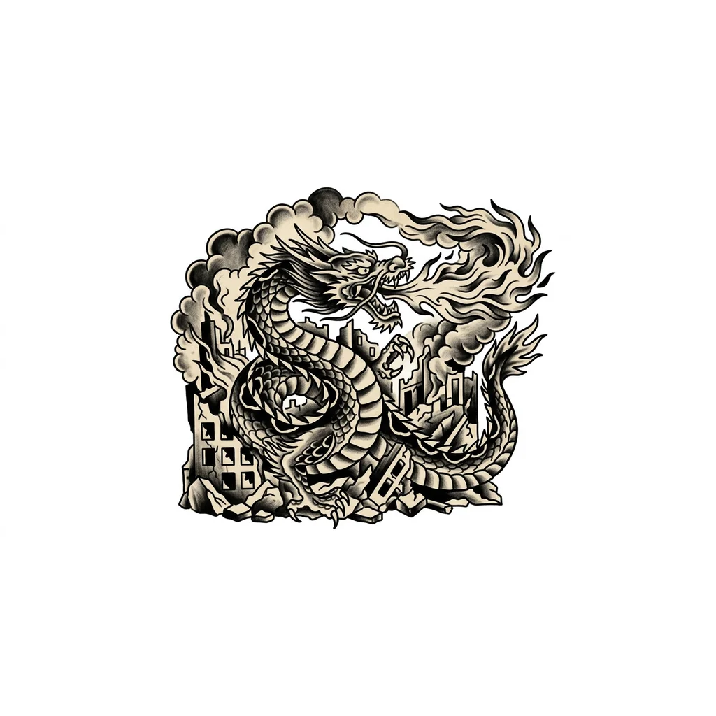 Дракон извергающий пламя в разрушенном г...