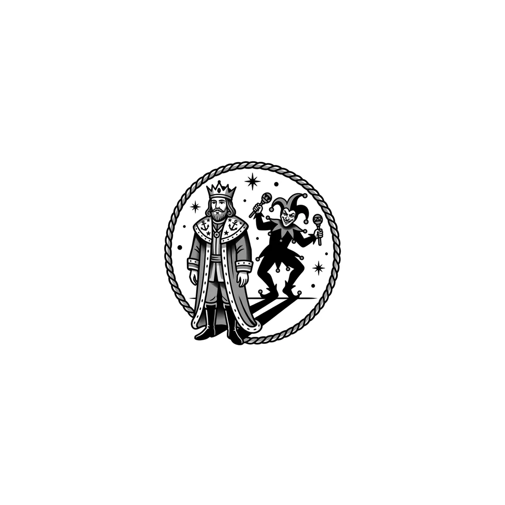 Стиль рисованный, приглушенные цвета, в стилистике обложек альбомов Короля и Шута, место расположения - запястье, небольшая, низкий уровень детализации, без надписей. На переднем плане стоит король, повёрнутый к нам лицом, в обычной, расслабленной позе, взгляд куда-то вдаль. Его тень представляет из себя шута с недоброй улыбкой в динамичной позе