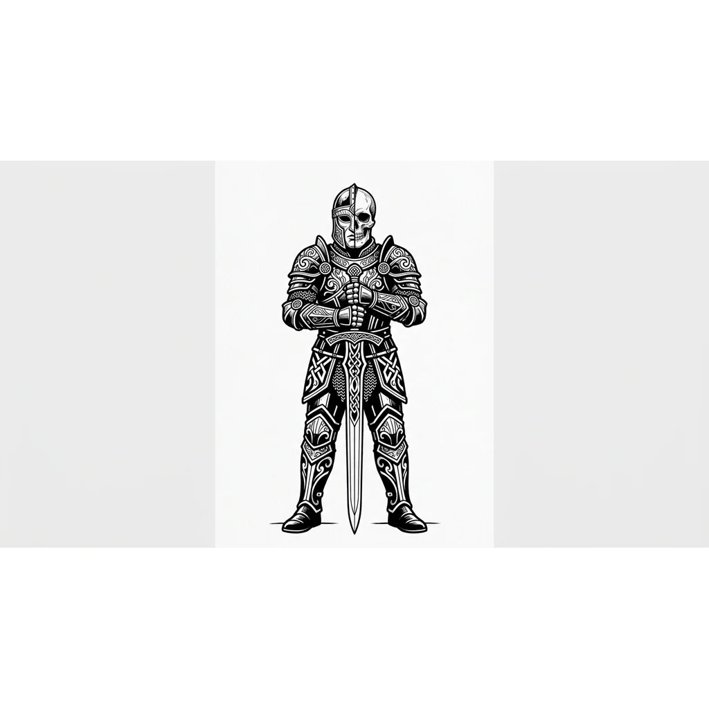 Сгенерируй эскиз воин в полный рост, в доспехах , на пол головы шлем с правой стороны , на пол череп , меч держит перед грудью двумя руками