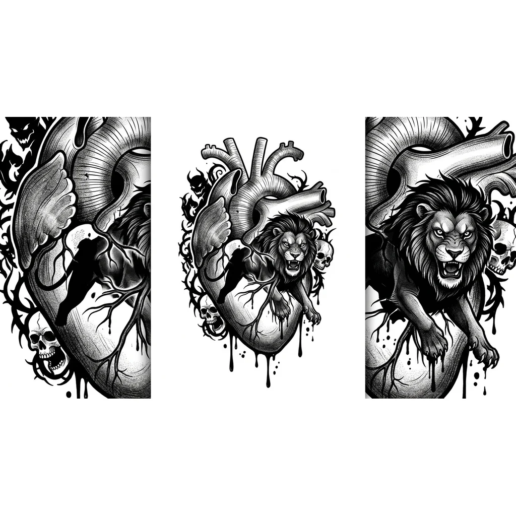 anatomical heart and lion. The heart is depicted translucent, in the style of a medical illustration (front view, internal structures are visible). The silhouette of a lion appears through its walls, bursting out. The lion is in motion, the head is turned towards the viewer, the gaze is direct. Art style: neo‑traditional. Rich black fills, clear contours, stylization elements. Colors: Black