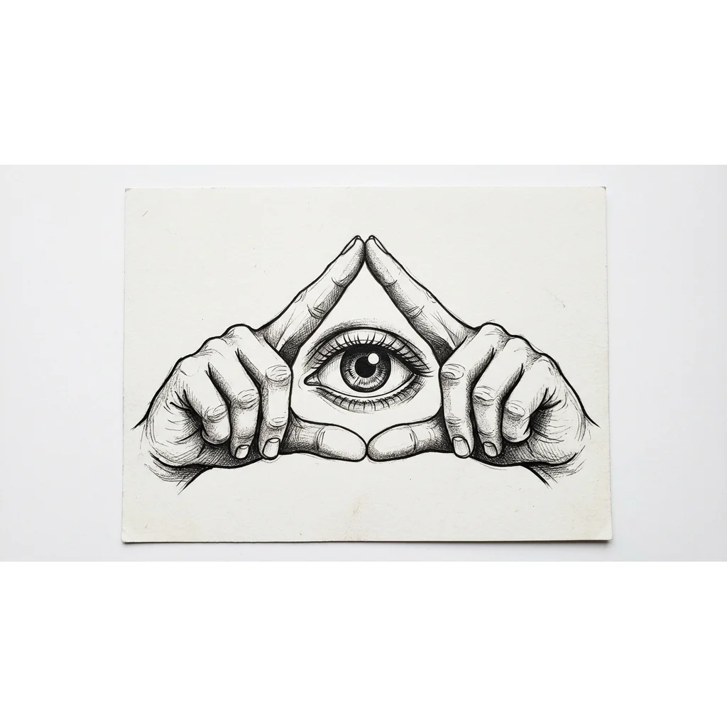 Создай эскиз, где руками сделан перевернутый треугольник, похожий на знак иллюминатов, а в центре находится глаз. Без лишних символов и надписей