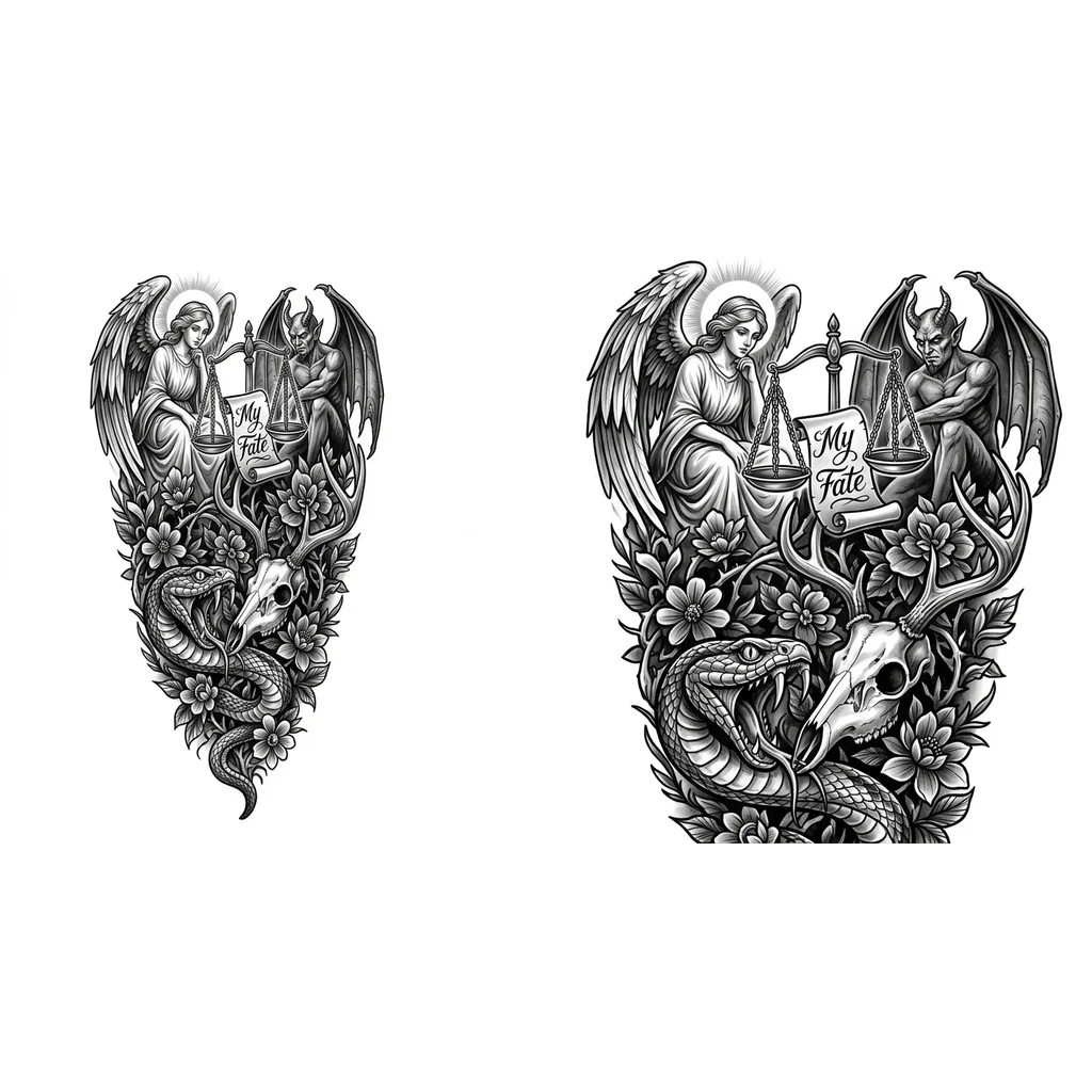 С низу змея начинает обкручивать ногу, языком залезая в череп оленя, все открытые места закрыты тенями и цветами выше седят ангел и демон а между ними весы и на них лежит твоя судьба