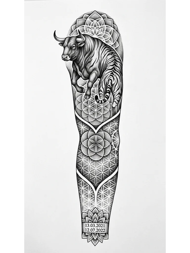 Тату от плеча до запястья На плече животное на половину бык на половину тигр внизу на запястье мелкие даты рождения 13.03.2021 и 12.07.2022