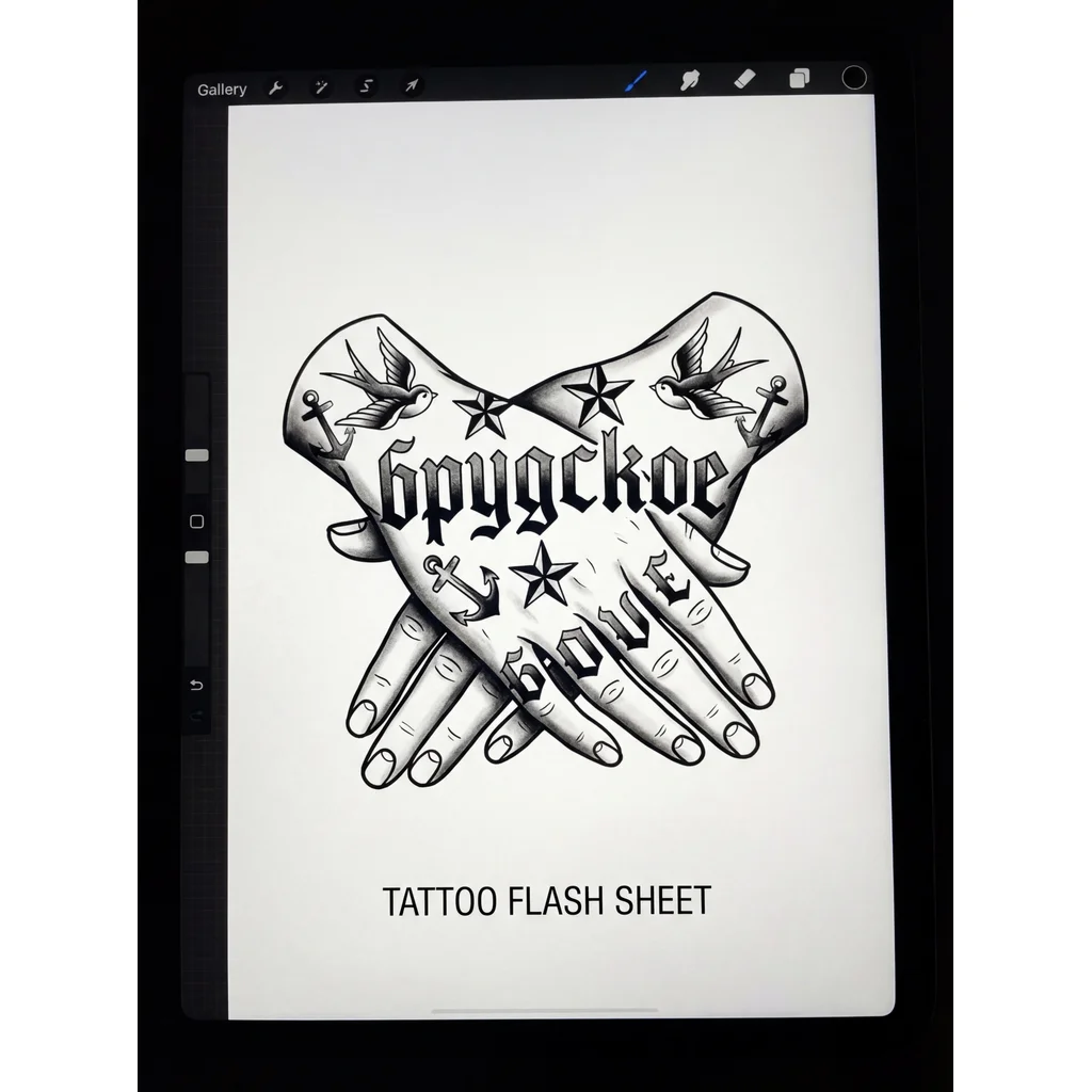 A detailed tattoo design sheet, traditional old school style. Human hands in a relaxed pose. Tattoo lettering "брудское" in bold Cyrillic gothic font across the fingers and upper hands. Sketch lines, ink wash background, white paper texture, clean linework, professional tattoo flash art. --ar 3:4