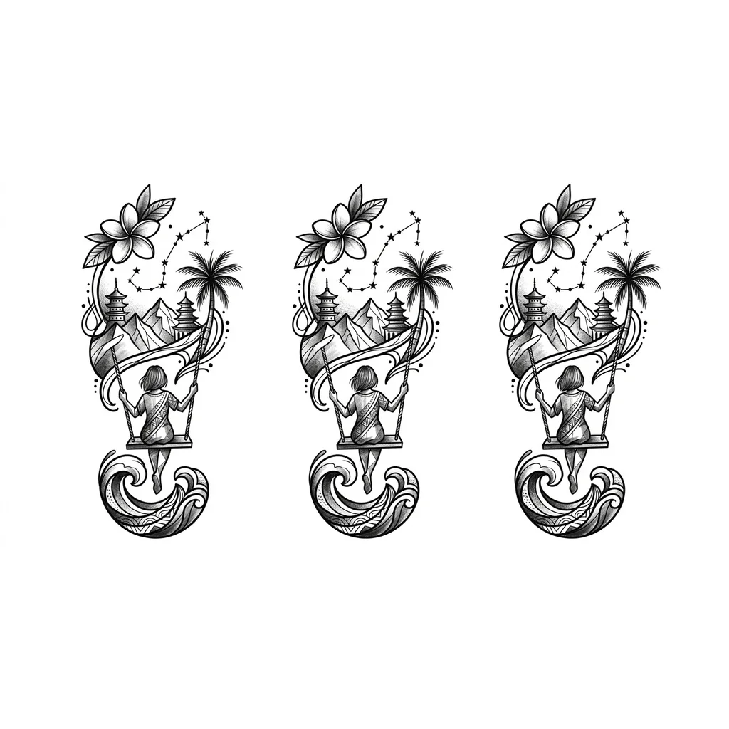 стиль геометрия-графика, внизу закручивающаяся волна, над волной девочка, качающаяся стоя на качелях - вид со спины, над девочкой горы, пагода, пальма, солнце, цветок франджипани и созвездие скорпиона.