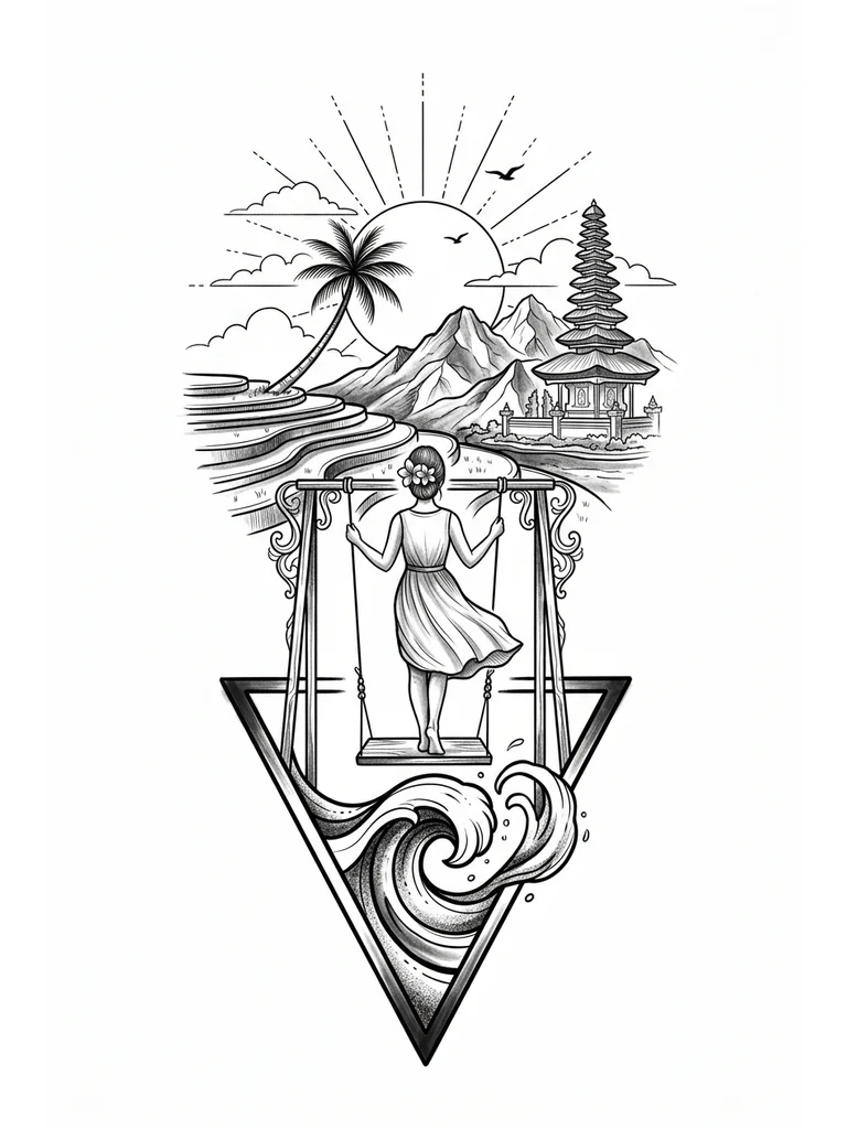 Стиль геометрия,графика,тонкая линия.Внизу закручивающаяся волна помещенная в треугольник и выходящая за его границы сверху.Над треугольником качели,на качелях стоит девочка в платье, которое развивается,вид со спины, волосы собраны в пучок,в волосах цветок франжипани.Над девочкой многоярусная терраса с рисовыми полями,одна изогнутая пальма на фоне заката,балийские горы,одна балийская пагода,солнце с тонкими лучами из черточек и точек,контуры облаков,две маленькие птицы