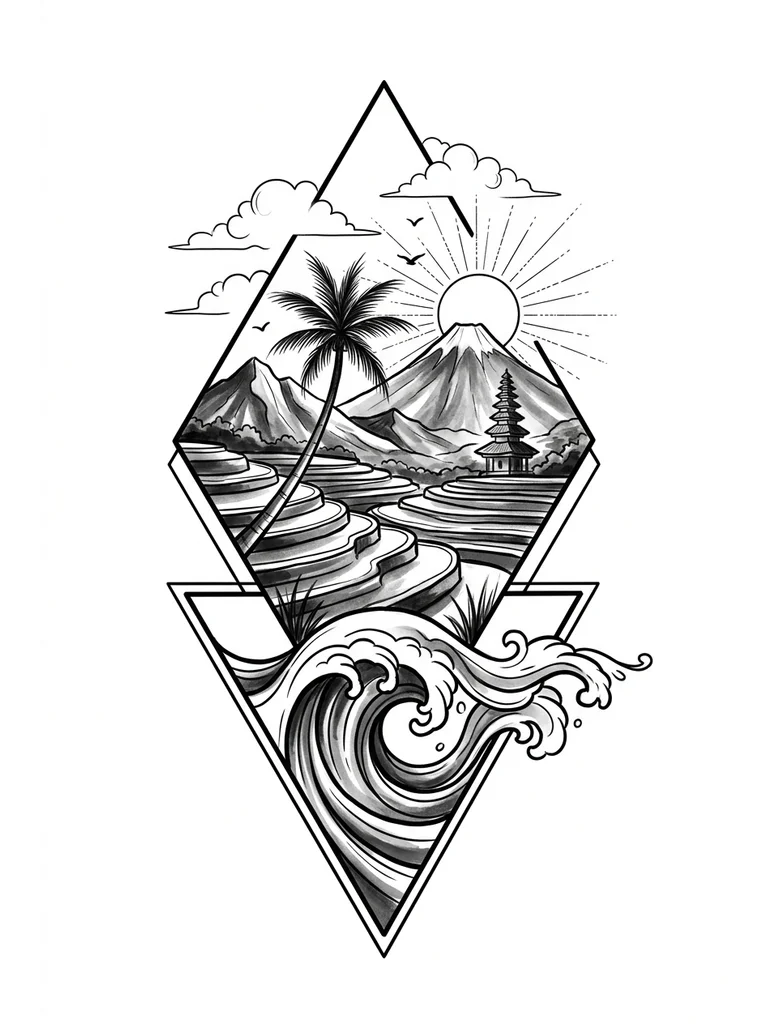 Стиль геометрия,графика.Внизу закручивающаяся волна помещенная в треугольник и выходящая за его границы Над треугольником ромб, в который вписаны и выходящие за его рамки многоярусная терраса с рисовыми полями,одна изогнутая пальма на фоне заката,балийские горы и вулкан,одна балийская пагода,солнце с тонкими лучами из черточек и точек,контуры пушистых облаков,две маленькие птицы