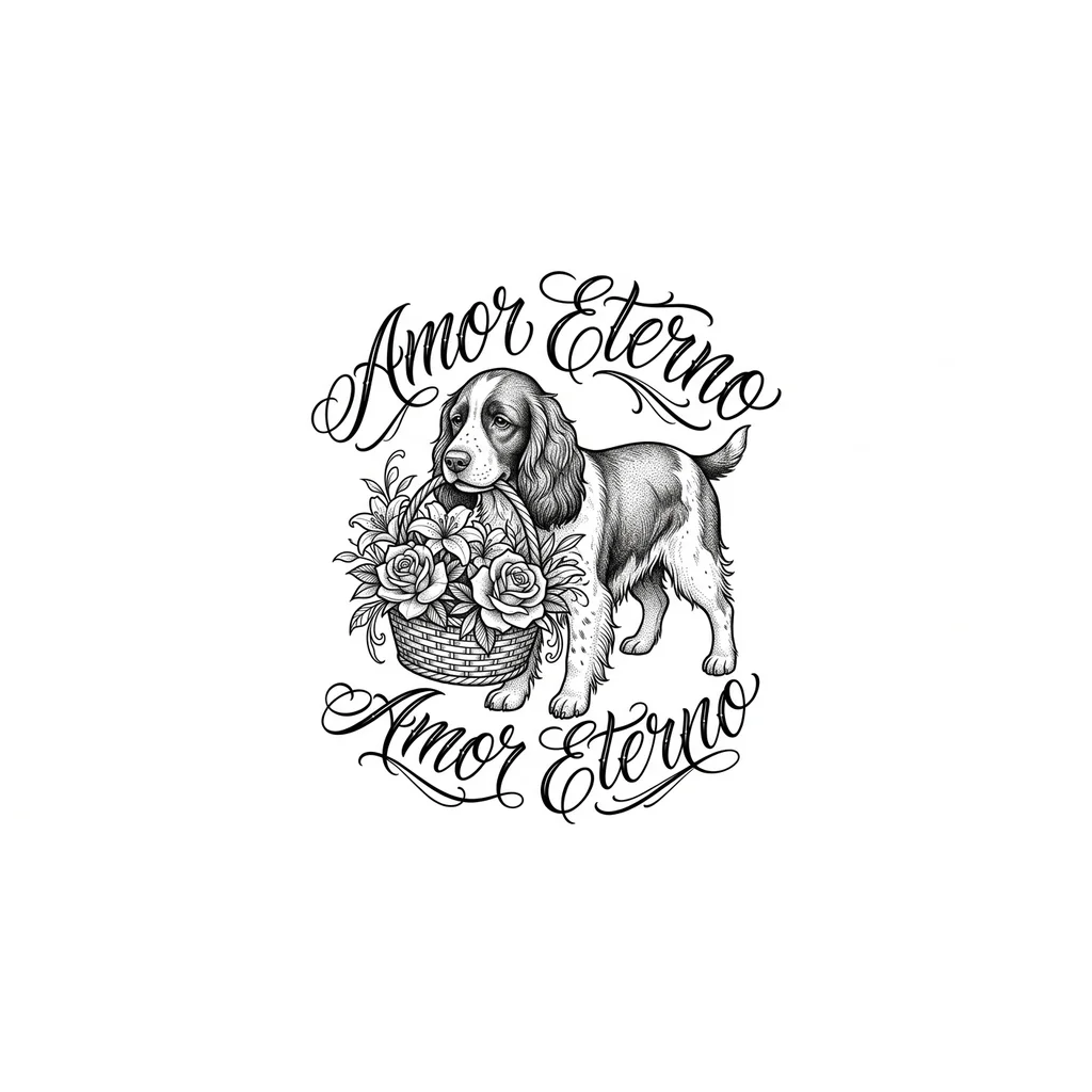 Спаниель пегий с корзинкой цветов в зубах