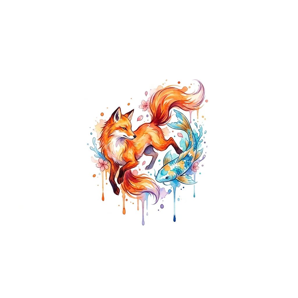 Аккуратное тату в азиатском стиле с лисой и рыбой