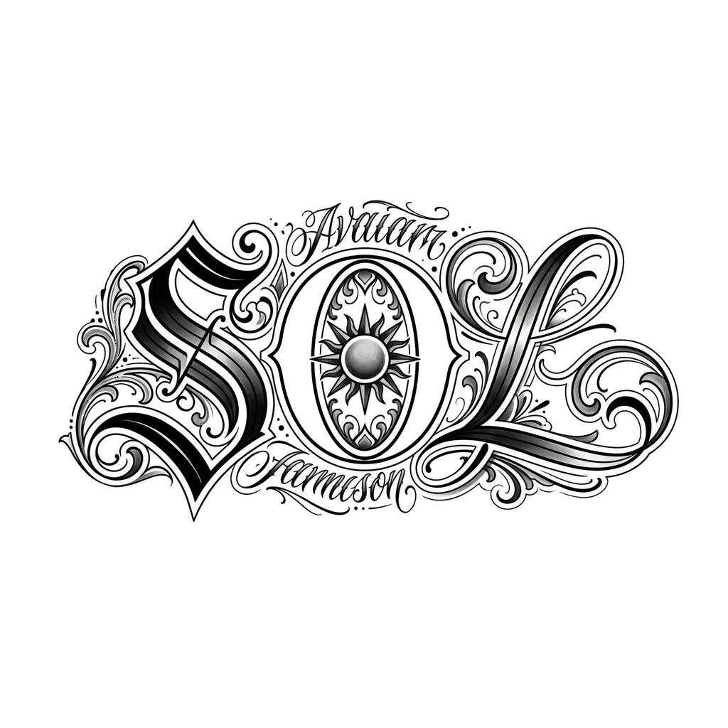 Тату буквы большие SOL на живот контур черный внутри белый