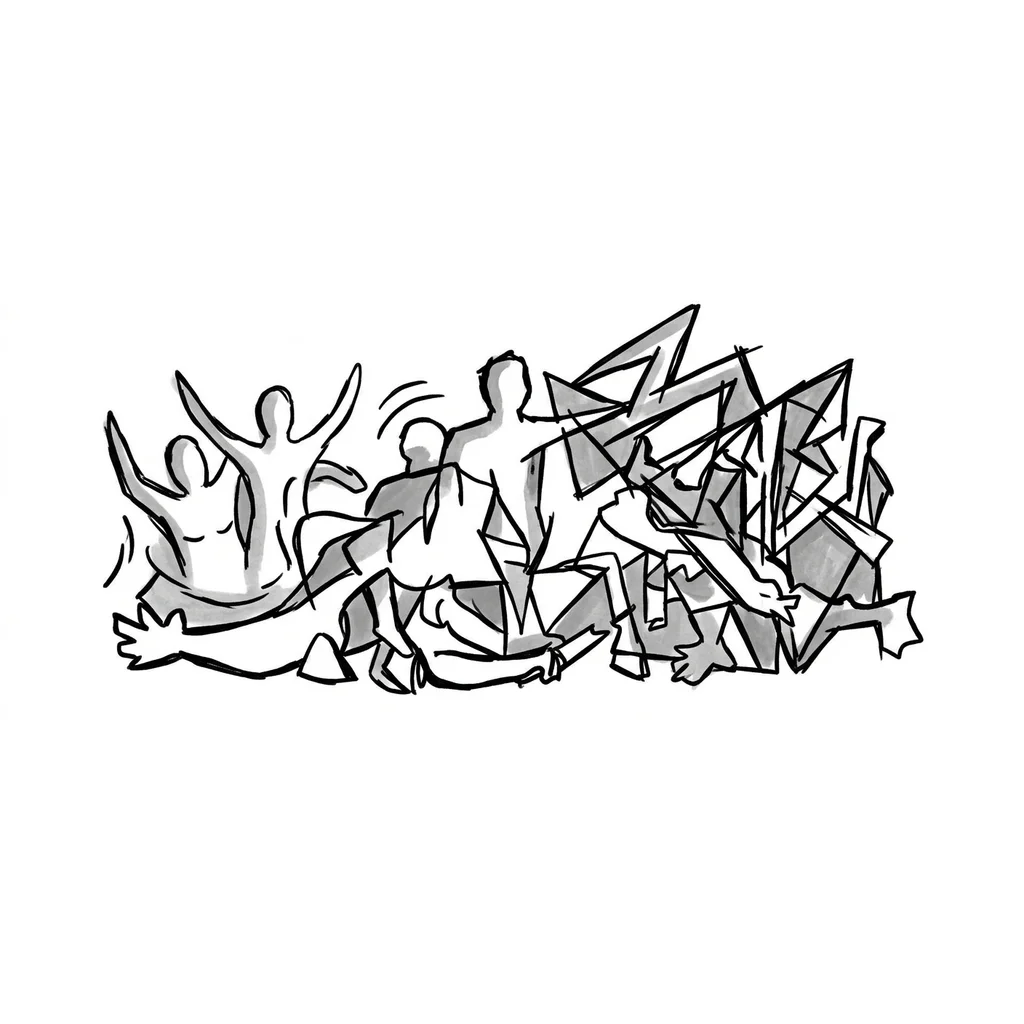 ЭСКИЗ силуэтов людей, которые выглядят только на половину, но они соедены. Силуэты в виде минимализма. Где левая часть показывает радость и успокоение, а другое надежду и страх. Углы более острые и в перемешку находятся. Сам стиль более неровный