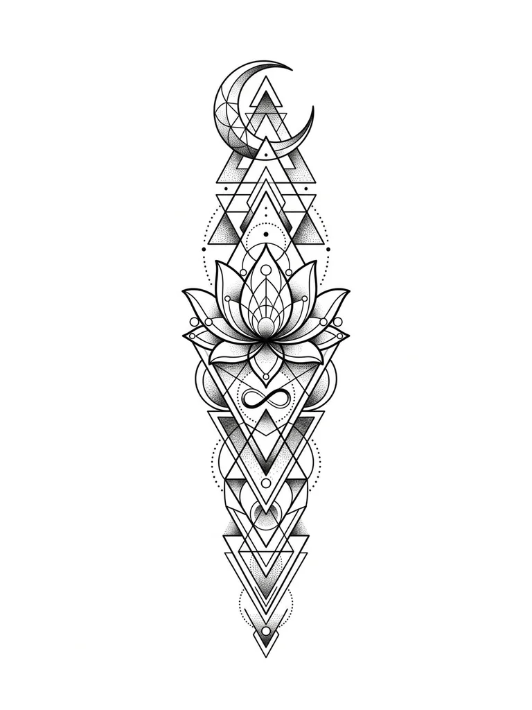 Тонкие линии,бесконечность,треугольники, точки,лотос, полумесяц,. Идёт от шеии к предплечье и проходит по руке
